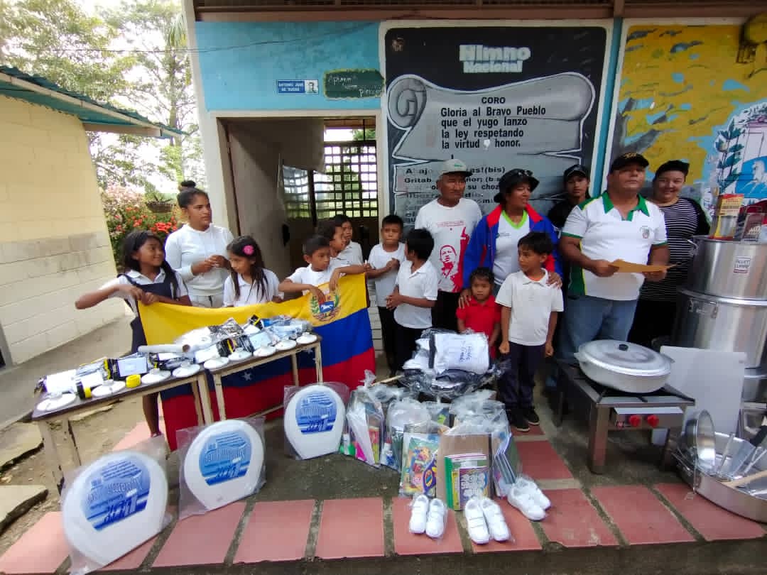 En este sentido, durante la entrega se asignaron  materiales de construcción e impermeabilización, pintura, bombillos, además utensilios e insumos de cocina  para el programa de alimentación Escolar, asi como alimentos, mientras que los estudiantes recibieron kit de uniformes, calzados y útiles escolares, para el mejoramiento de infraestructura y funcionamiento de esta institución.