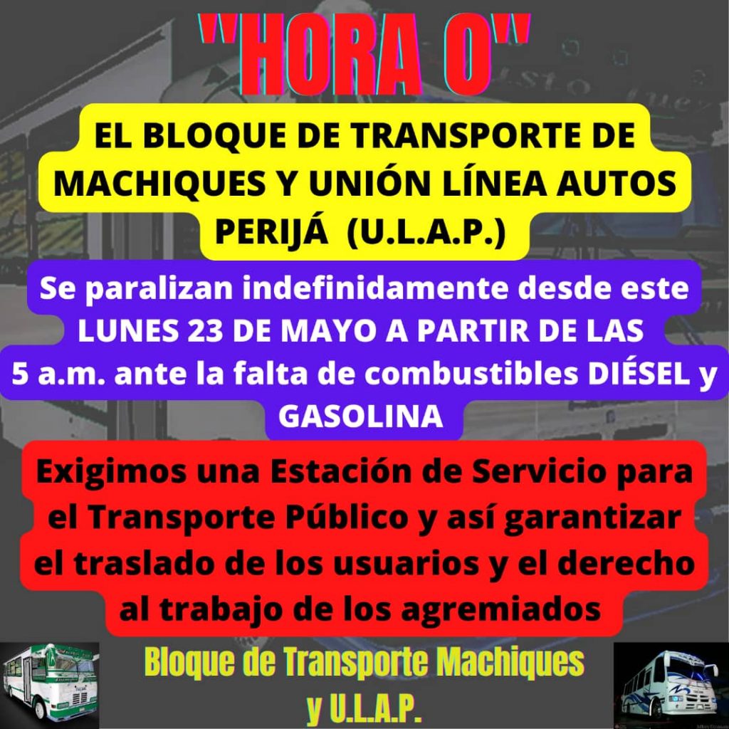 Asimismo se pudo conocer que las líneas de Machiques Rosario de Perijá, San Cristóbal hacia el zulia Costa Oriental del Lago y la Guajira El Zulia también se unirán a este llamado a Paro Indefinido a partir de las 5 de la mañana de este Lunes 23 de mayo.