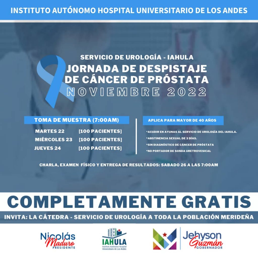 Los especialistas y residentes de urología del Instituto Autónomo Hospital Universitario de Los Andes (Iahula) estiman atender un total de 300 hombres en una jornada gratuita de despistaje de cáncer de próstata.