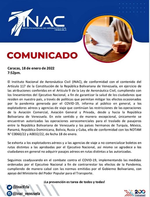 El Instituto Nacional de Aeronáutica Civil (Inac), informó este martes en horas de la noche que se mantienen las restricciones de las operaciones aéreas desde y hacia Venezuela.