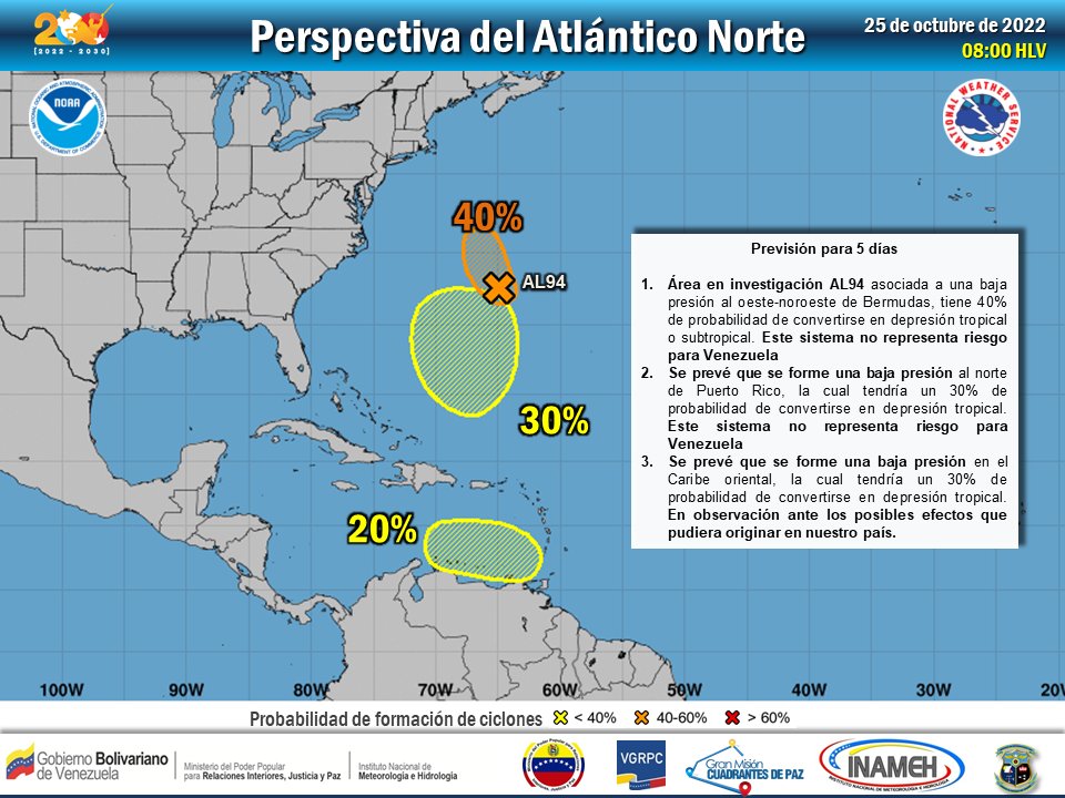 Por otra parte, Inameh aclaró que el área en investigación AL94 asociada a una baja presión al oeste-noroeste de Bermudas, tiene 40% de probabilidad de convertirse en depresión tropical o subtropical. Igualmente se prevé que se forme una baja presión al norte de Puerto Rico. Estos sistemas no representan riesgo para Venezuela.