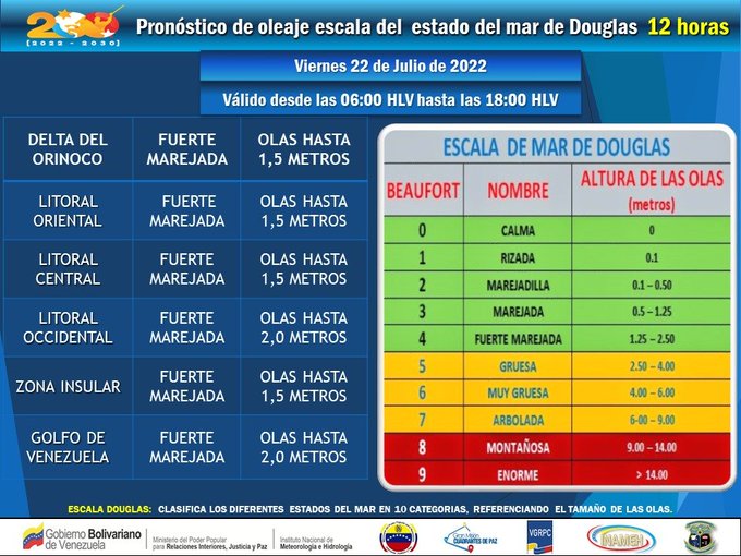 Por otra parte, Inameh también detalló que en el Delta del Orinoco, Zona Insular Litoral Central y Litoral Oriental se pueden presentar olas de hasta 1,5 metros de altura. Por su parte, en el Litoral Occidental y el Golfo de Venezuela, el pronóstico habla acerca de un oleaje de 2 metros.
