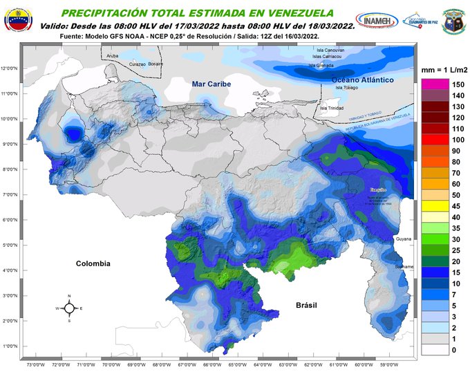 El organismo señaló en su reporte diario en la red social Twitter, que se esperan lluvias o lloviznas en áreas del Zulia, Amazonas, Bolívar y el Esequibo. Además podrían originarse precipitaciones dispersas en Andes, Llanos Occidentales y Centrales, Nororiente y Delta Amacuro.