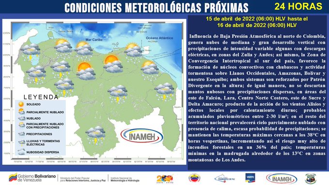 Asimismo, la Zona de Interconvergencia tropical al sur del país favorecen la formación de núcleos convectivos con chubascos y actividad tormentosa sobre Llanos Occidentales, Amazonas, Bolívar y el Esequibo.