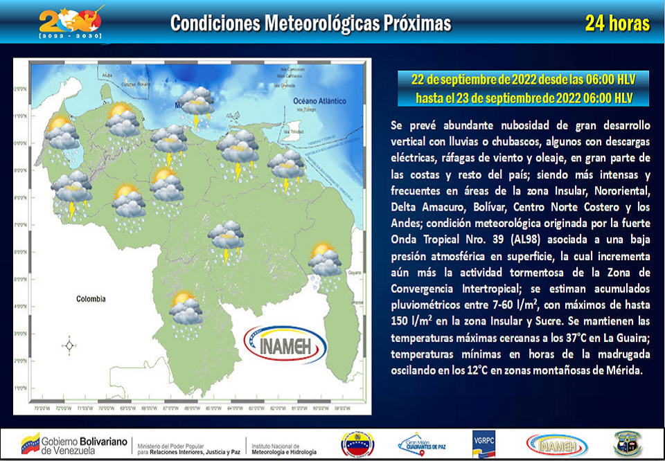 La información la dio a conocer el instituto por medio de su cuenta de Twitter @INAMEH, donde resalta que la Onda Tropical número 39 se ubica sobre el oriente de Venezuela.