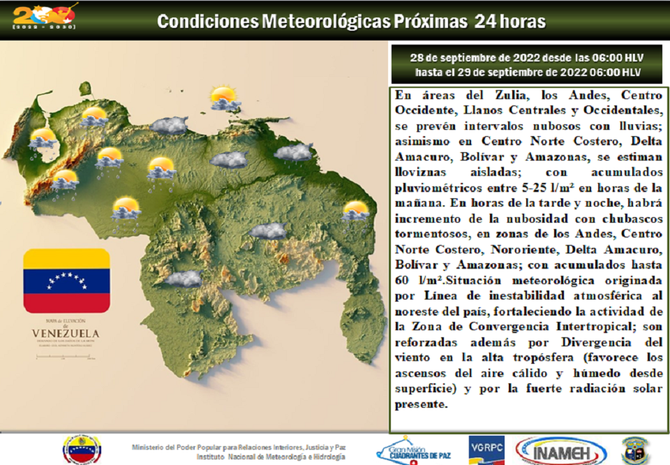 El Instituto Nacional de Meteorología e Hidrología (INAMEH), prevé para este miércoles abundante nubosidad con precipitaciones en el Zulia, Los Andes, Centro Occidente, Llano Centrales y Occidentales. Asimismo, en la región Centro Norte Costero, Delta Amacuro, Bolívar y Amazonas, se estiman lloviznas aisladas.