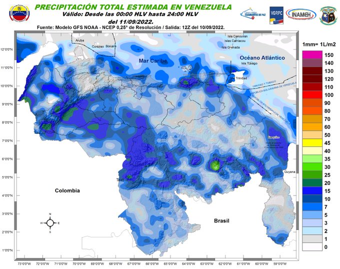 El Instituto Nacional de Meteorología e Hidrología (Inameh) reportó este domingo 11 de septiembre a través de su cuenta en Twitter que se esperan para hoy áreas nubladas con precipitaciones de intensidad variable en varios puntos del Territorio Nacional.