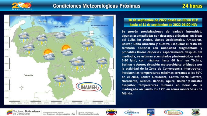 El Instituto Nacional de Meteorología e Hidrología (Inameh) reportó este sábado 10 de septiembre a través de su cuenta en Twitter que se esperan para hoy áreas nubladas con precipitaciones y descargas eléctricas en varios estados del país.