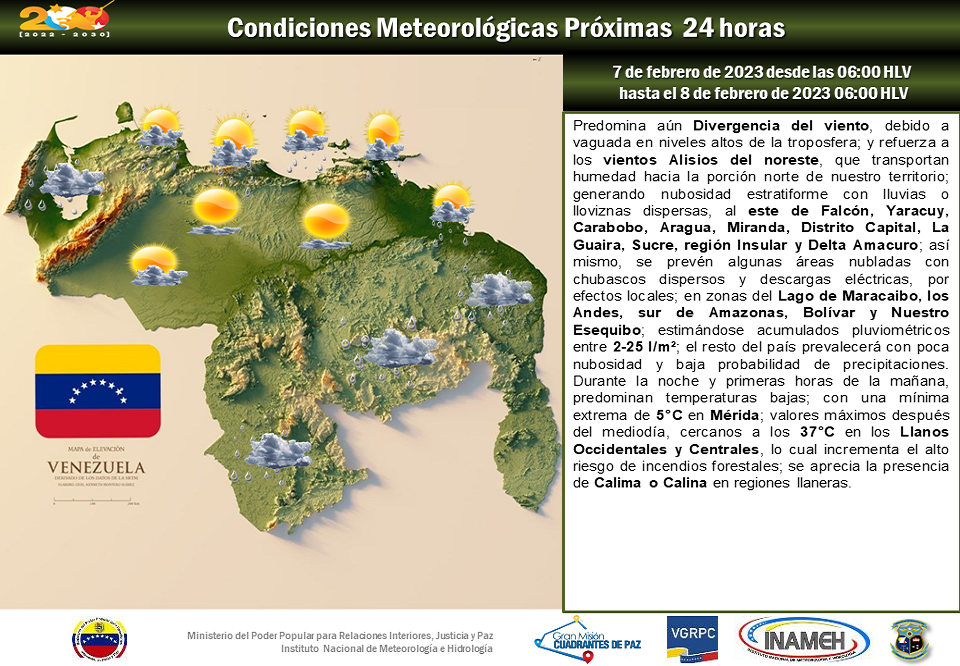 El resto del país prevalecerá con poca nubosidad y baja probabilidad de precipitaciones. Durante la noche y primeras horas de la mañana, predominan temperaturas bajas; con una mínima extrema de 5°C en Mérida; valores máximos después del mediodía, cercanos a los 37°C en los Llanos Occidentales y Centrales, lo cual incrementa el riesgo de incendios en estas regiones.