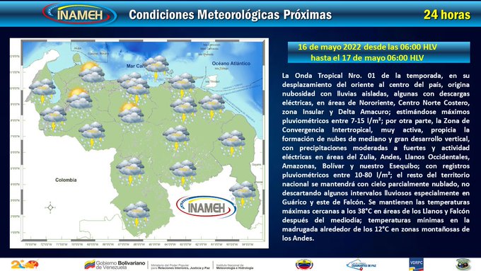Según el Instituto Nacional de Meteorología e Hidrología (Inameh), núcleos convectivos refuerzan la Zona de Convergencia Intertropical, lo que originará lluvias moderadas o fuertes, algunas con descargas eléctricas en áreas de Sucre, Monagas, Delta Amacuro, Nueva Esparta, Bolívar y el Esequibo.
