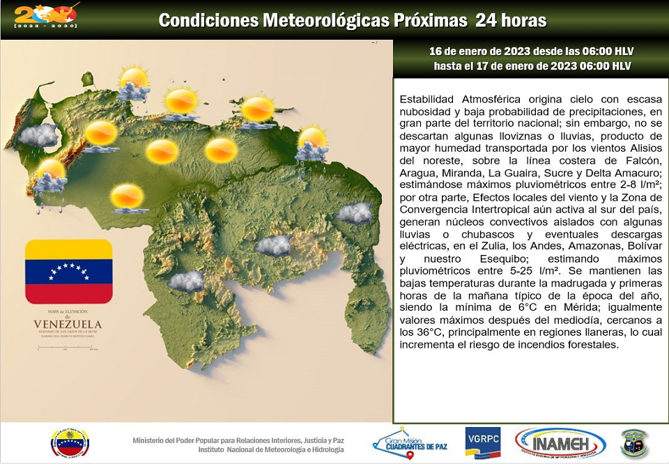 El Instituto Nacional de Meteorología e Hidrología (Inameh) Lluvias y chubascos dispersos, algunos con descargas eléctricas en el sur del Zulia, Amazonas, Bolívar y El Esequibo.