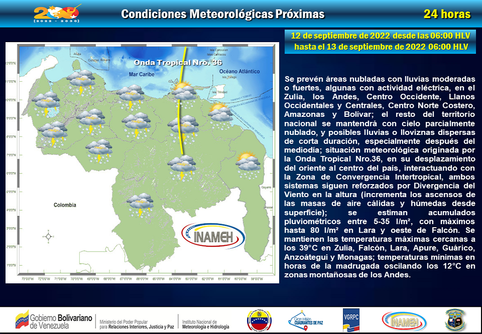 Se estiman acumulados pluviométricos, entre 5-35 l/m², con máximos hasta 80 l/m² en Lara y Oeste de Falcón.
