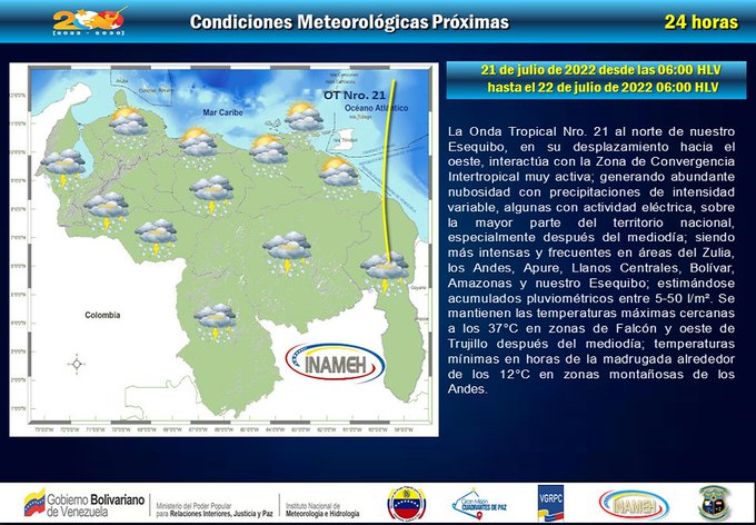 La temperatura máxima estimada es de 37 °C en zonas del estado Falcón y oeste de Trujillo después del mediodía, mientras que la mínima estará en 12 °C en la zona montañosa de los Andes en horas de la madrugada.