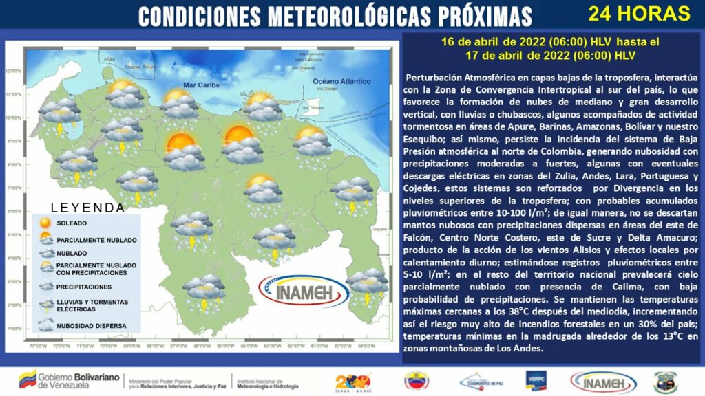 Entre este Sábado Santo 16 de abril y el Domingo de Resurrección, se presentarán perturbaciones atmosféricas en capas bajas de la estratósfera e interectuará con la Zona de Convergencia Intertropical al sur del país, favoreciendo a la conformación de nubes de mediano y gran desarrollo, con lluvias o chubascos acompañados de actividad tormentosa en Apure, Barinas, AMazonas, Bolívar y el Esequibo.