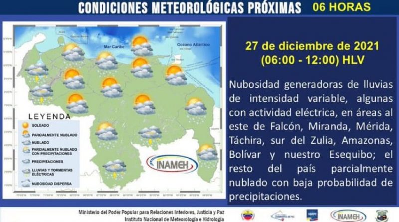 El Instituto Nacional de Meteorología e Hidrología (Inameh) informó que se espera nubosidad en gran parte del país generando lluvias de intensidad variable en Falcón, Miranda, Mérida, Táchira, Amazonas, Bolivar y el sur del Zulia.