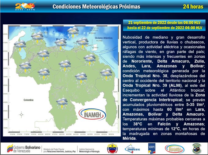 Asimismo, persisten las temperaturas máximas cercanas a los 38 °C en Falcón y Amazonas y temperaturas mínimas en horas de la madrugada, oscilando los 12 °C en zonas montañosas de Mérida.