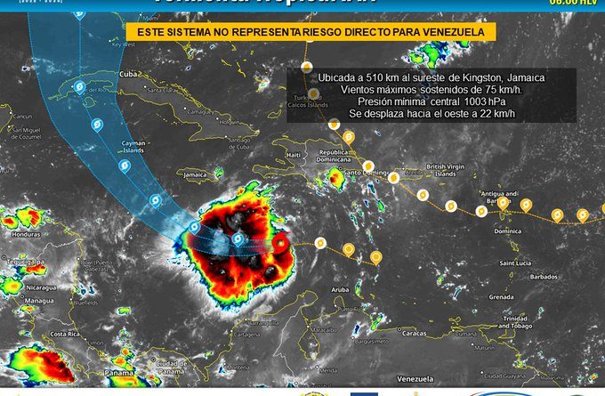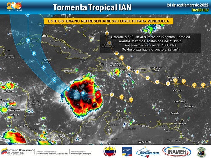 “Tormenta Tropical IAN en el Caribe central, se ubica a 510 km al sureste de Kingston, Jamaica, con vientos máximos sostenidos de 75 km/h y desplazamiento hacia el oeste a 22 km/h. Este sistema no representa riesgo directo para Venezuela”, notificó el Inameh.