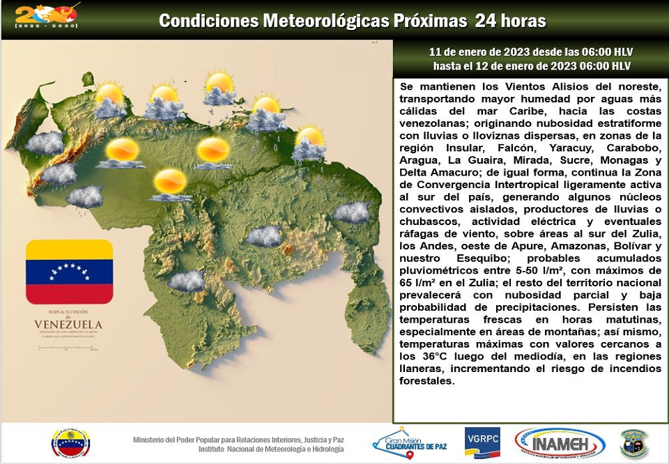 El organismo indicó en su reporte diario de Twitter que podrían originarse lluvias dispersas en Región insular, Falcón, Yaracuy, Carabobo, Aragua, Miranda, La Guaira, Sucre, Monagas y Delta Amacuro.