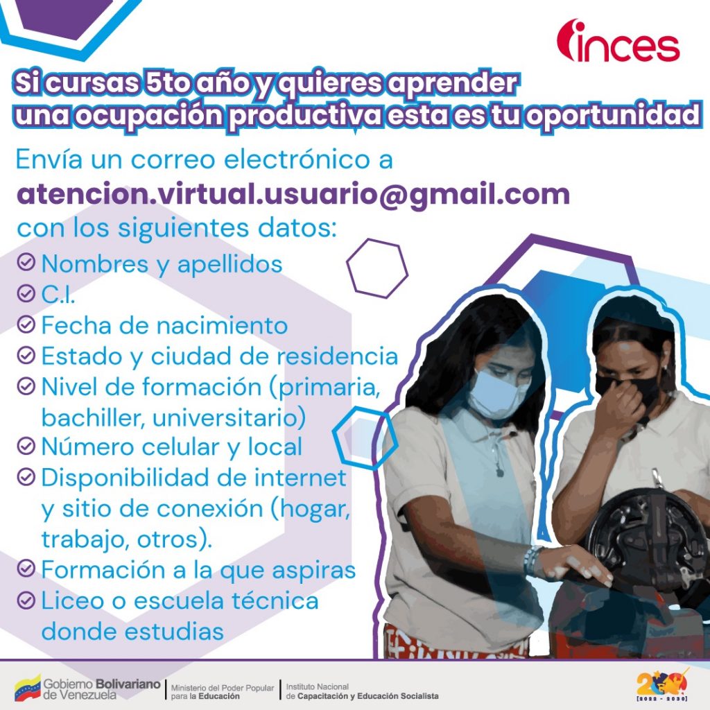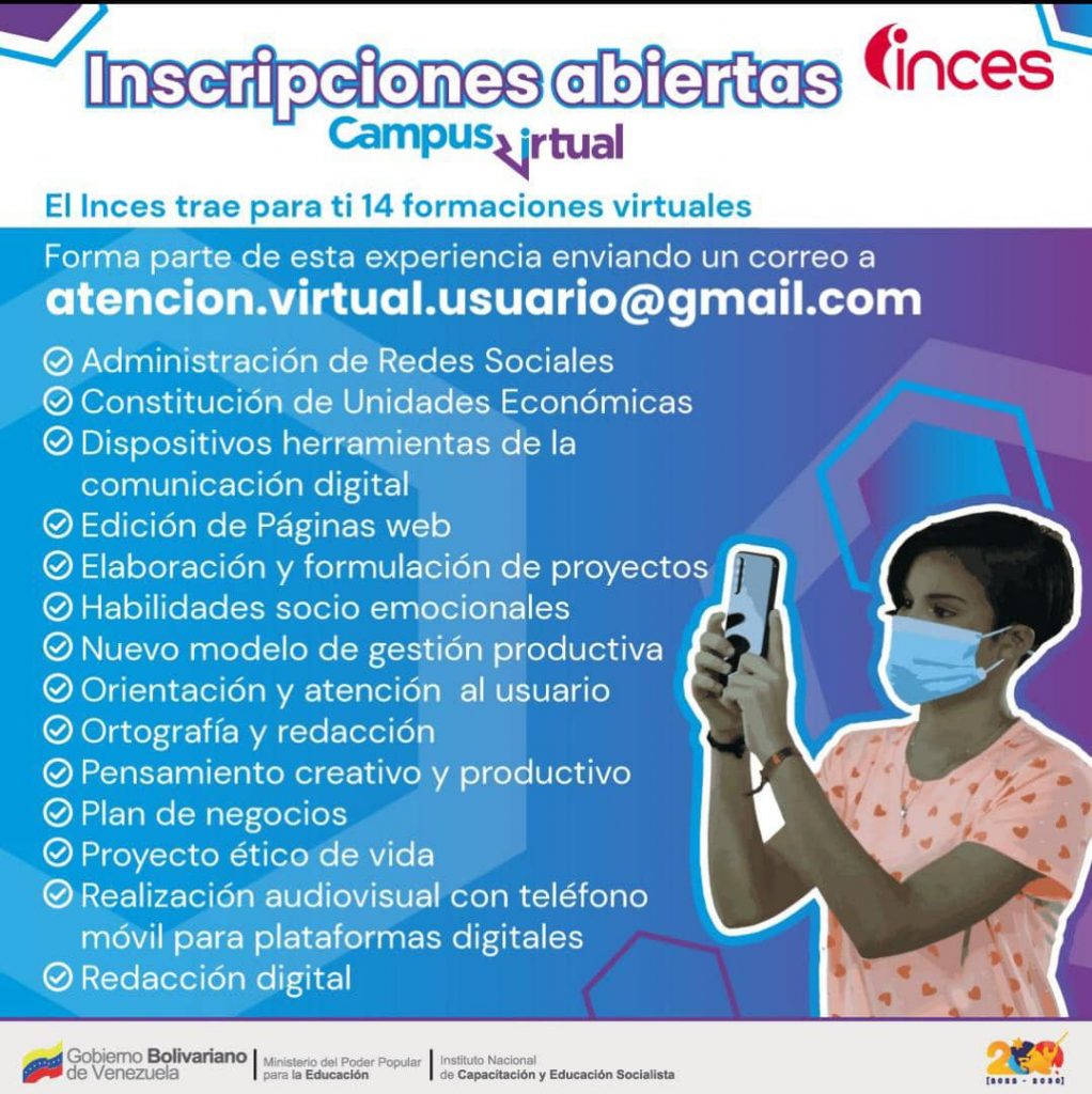 Sin embargo, a petición de quienes se acercan a los más de 140 centros de formación Inces de todo el país y a los comentarios que se reciben vía redes sociales, cualquier persona puede postularse para cursar las formaciones habilitadas en el Campus Virtual Inces.