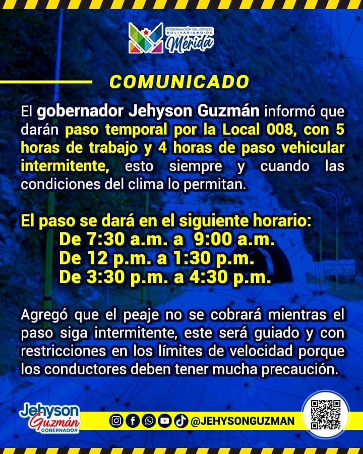 Este gran avance fue anunciado en exclusiva, por el gobernador del estado Mérida, Jehyson Guzmán en su programa semanal, “Patria que Lucha”, la mañana de este jueves por diversas emisoras, luego del cierre de esta carretera producto de los multiples deslaves por la vaguada ocasionada por las lluvias desde hace dos meses.