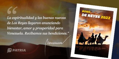 Inicia la entrega del Bono de Reyes 2022 enviado por el Presidente Nicolás Maduro a través de la Plataforma Patria. La entrega tendrá lugar entre los días 6 al 15 de enero de 2022.