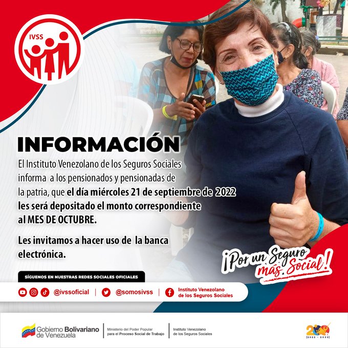 El Instituto Venezolano de los Seguros Sociales (IVSS) informó que este miércoles 21 de septiembre les será depositado el monto de las pensiones, correspondientes a octubre de 2022.