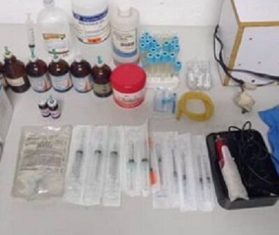 La detención se logró mediante una programación de consulta médica controlada, donde se incautó como evidencia una máquina centrifugadora de sangre de fabricación rudimentaria, un par de guantes quirúrgicos, 39 tubos de ensayo, 11 jeringas, seis ampollas de anestesia local, una liga para torniquete, un yelco, alcohol para quemar, citrato de sodio, cloruro de sodio, solución fisiológica, anestesia local, solución anticelulítica, extracto de silicio, líquido homeopático, cuatro ampollas de complejo vitamínico y 30 bisturís quirúrgicos.