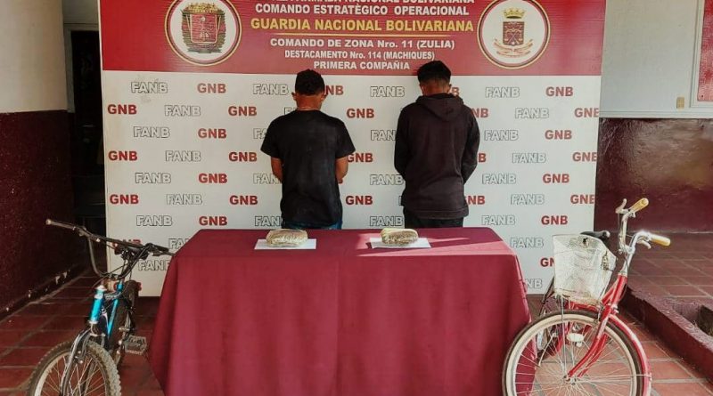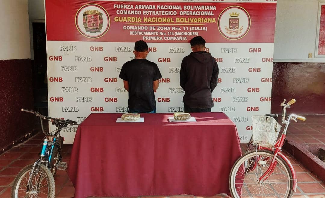 La tarde de este 23 de febrero, en el marco del Sistema Defensivo Territorial y bajo acciones de intervención legal, el Comando de Zona de la GNB N°11 Zulia, reportó la detención de dos ciudadanos, que iban en bicicletas, y llevaban dos panelas de droga tipo marihuana.