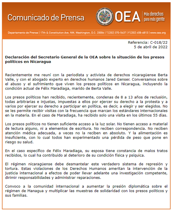 En un comunicado en su cuenta de Twitter, Almagro dijo haberse reunido con la periodista y activista Berta Valle, esposa del líder opositor Félix Maradiaga, y el abogado experto en derechos humanos Jared Genser, con quienes abordó el «abuso y sufrimiento de los presos políticos».
