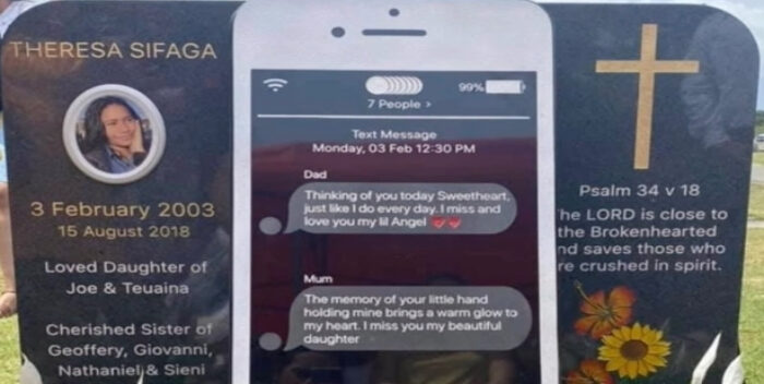 La lápida presenta mensajes que la familia neozelandesa le envió a Theresa. Un mensaje de su padre, que incluye emojis de corazón dice: “Pensando en ti hoy cariño, como lo hago todos los días. Te extraño y te amo mi pequeño ángel ?? ??”.