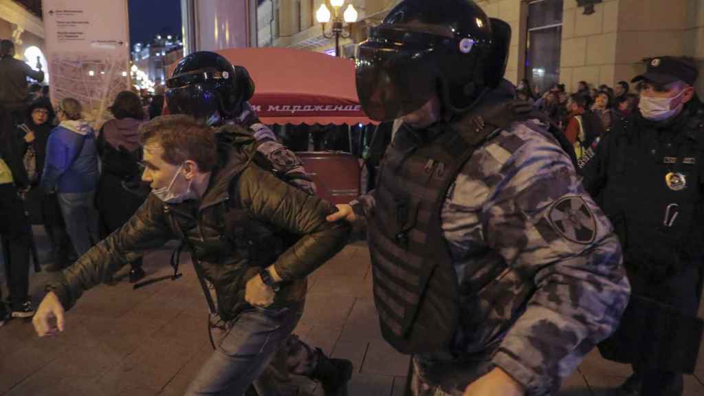 Los ciudadanos intentaron crear cadenas humanas para evitar las detenciones, mientras que los policías crearon cordones para impedir el paso de los manifestantes, que tienen la intención de bajar por la calle Arbat hasta llegar al Ministerio de Exteriores.