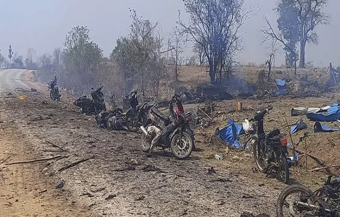 Los socorristas y los equipos médicos no han podido regresar al lugar del ataque porque los aviones militares continúan sobrevolando la ciudad, aunque no ha habido más ataques, dijo Aung Myo Min anteriormente.