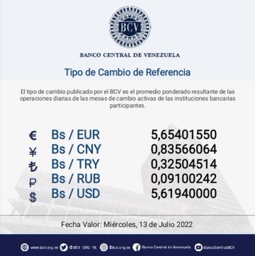 Las mesas de cambio que operan en el país cotizaron el valor del dólar, para este miércoles, en Bs. 5, 61, mientras que el euro se cotiza en Bs. 5,65, publicó el Banco Central de Venezuela (BCV) en su cuenta de Twitter, @BCV_ORG_VE.