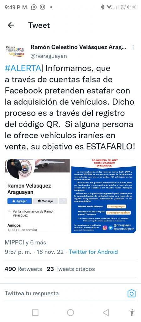 En un comunicado expuesto por la oficina de Velásquez Araguayán aclaró que la gestión de adquisición de estos vehículos se realiza solo con el escaneo del código QR. “La comercialización de los vehículos marca IKCO, SAIPA y tractores VENIRÁN es únicamente por la plataforma automatizada publicada en las cuentas oficiales”, dice parte de la misiva.