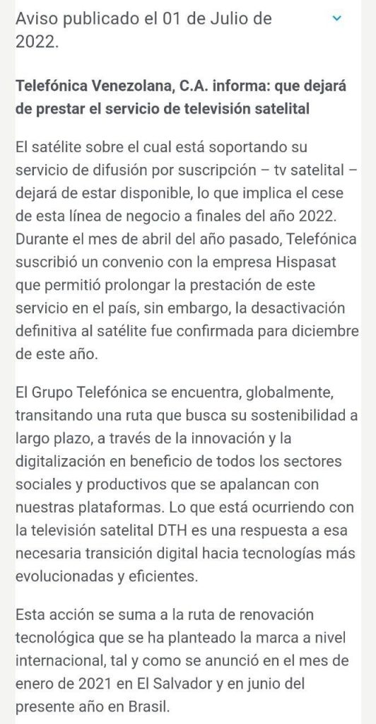 Telefónica Venezolana C. A. informó, hace minutos, que dejará de prestar el servicio de televisión satelital en el país en diciembre.