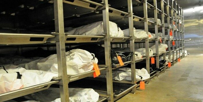 La dimensión de la tragedia se refleja en las docenas de bolsas de color blanco, todas acomodadas dentro de los refrigeradores, identificadas solamente con una tarjeta de color anaranjado.