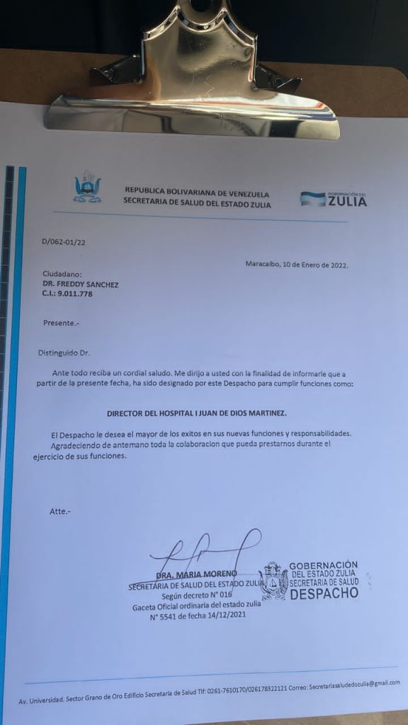 En horas de la mañana de este lunes #10-Ene, en una reunión donde estuvo presente la comisión de enlace de la gobernación del Zulia, el alcalde de Sucre, Yonys González, Luis Morales, presidente de la Cámara Municipal y otras personalidades se dio el formal nombramiento al nuevo director del hospital tipo I Juan de Dios Martinez, de Caja Seca; cargo que asumirá desde ya el Dr. Freddy Sánchez, reconocido gineco-obstreta de la zona.
