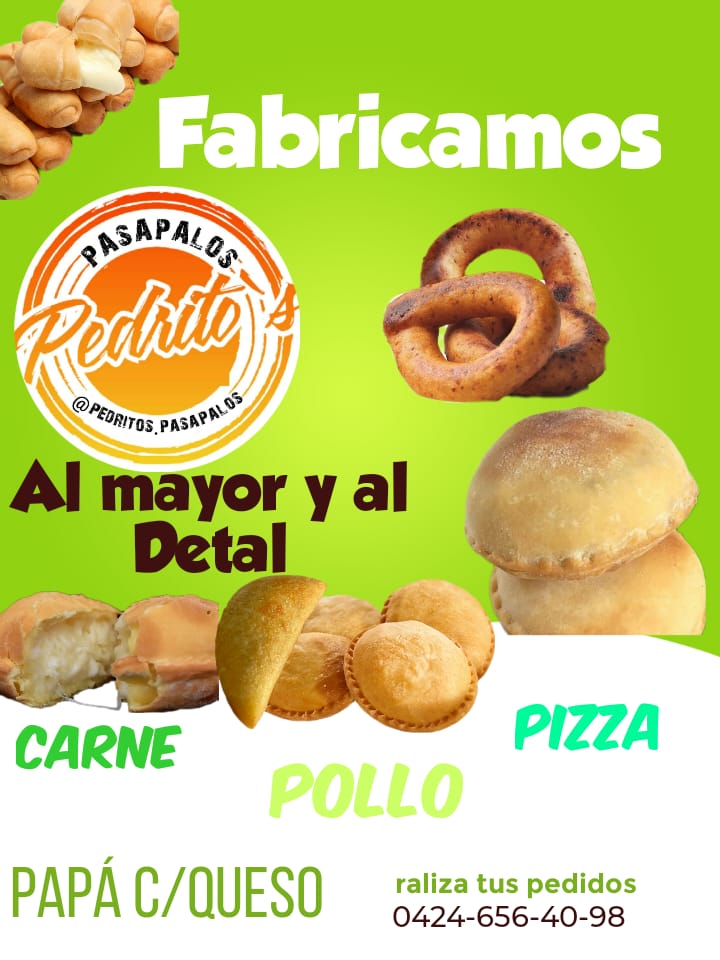 @pedritos.pasapalos es su cuenta en Instagram además tiene un número telefónico para que usted haga sus pedidos al 0424-6564098 y si tiene alguna celebración, u ocasión especial no dude en solicitar la información de la amplia gama en pasapalos que ofrece está pequeña empresa familiar dedicada al trabajo, esfuerzo, y pasión por la calidad manifiesta en sus productos y atención.