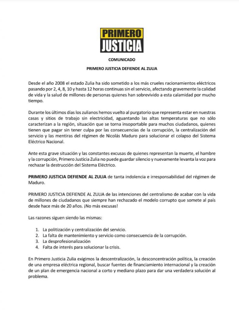 Ante el recrudecimiento de la crisis eléctrica y los constantes apagones de 5, 12 y hasta 24 horas a las que están siendo sometidos todos los municipios del Zulia, Primero Justicia alza la voz en defensa de todos los zulianos para una vez más rechazar la destrucción del Sistema Eléctrico Nacional por parte del régimen y para exigir una verdadera solución a esta problemática que tiene más de 14 años azotando al país y especialmente al Zulia.