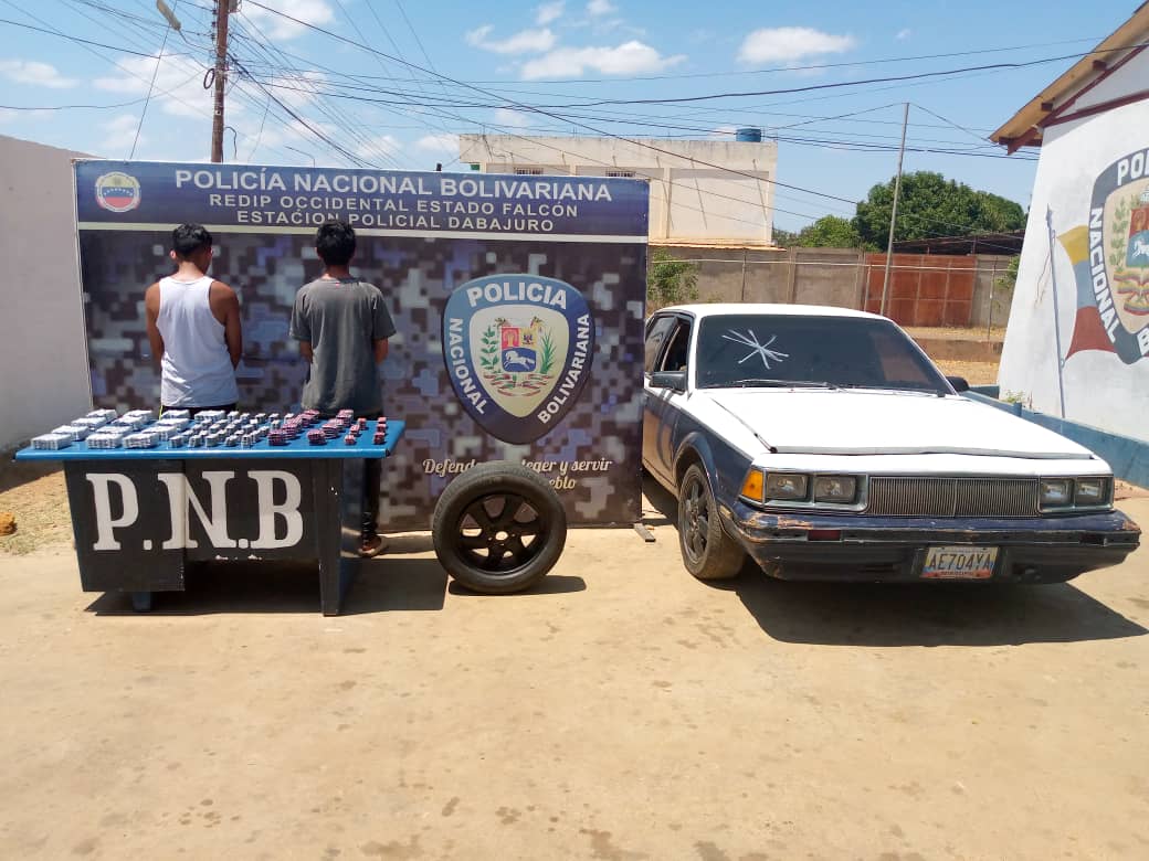 La aprehensión se registró en el sector Las Tinajitas, carretera nacional Falcón – Zulia, municipio Dabajuro, cuando los referidos ciudadanos viajaban a bordo de un vehículo Chevrolet modelo Century y adoptaron una actitud nerviosa al notar la presencia de los efectivos policiales, quienes amparados en la ley procedieron a inspeccionar a los individuos y el automotor, notando que en el maletero del mismo llevaban un caucho de repuesto que presentaba características irregulares.