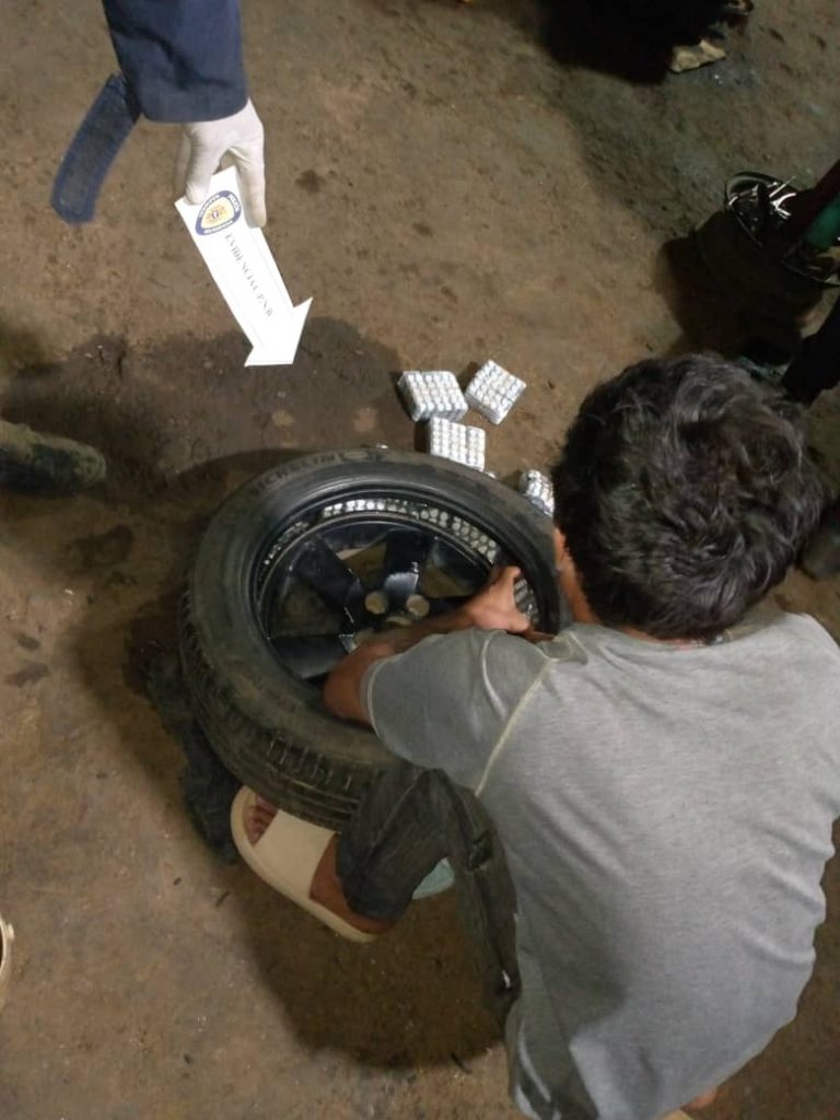 Seguidamente los oficiales procedieron a verificar la llanta en cuestión, hallando oculta dentro de la misma un total de 809 blíster de diferentes medicamentos, hecho por el cual los dos sospechosos fueron aprehendidos y llevados bajo custodia al centro policial local.