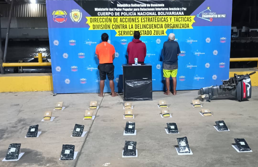 Durante labores de patrullaje en el Lago de Maracaibo, comisión de la División Contra La Delincuencia Organizada en la Redip Occidental PNB, procesó la detención de David Gerardo Paz Nava (31) , Carlos Eduardo Paz Nava (40) y Arturo Segundo González Paz (66), por el delito de tráfico de drogas, logrando incautarles veinte (20) envoltorios de regular tamaño de presunta marihuana, con un peso aproximado de 10,525kg, los cuales llevaban ocultos a bordo de una (01) embarcación tipo peñero, marca Yamaha con motor fuera de borda que también fue retenida como parte de las evidencias, además de un (01) teléfono celular.