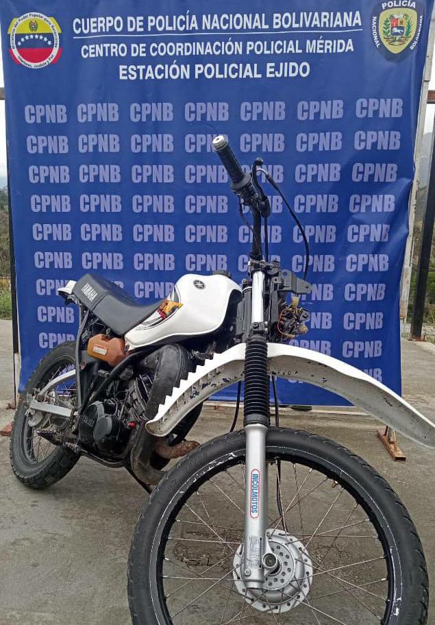 Efectivos adscritos a la estación policial Campo Elías de la Policía Nacional Bolivariana (PNB) recuperaron una moto que estaba solicitada por el delito de robo en la ciudad de Ejido del estado Mérida.