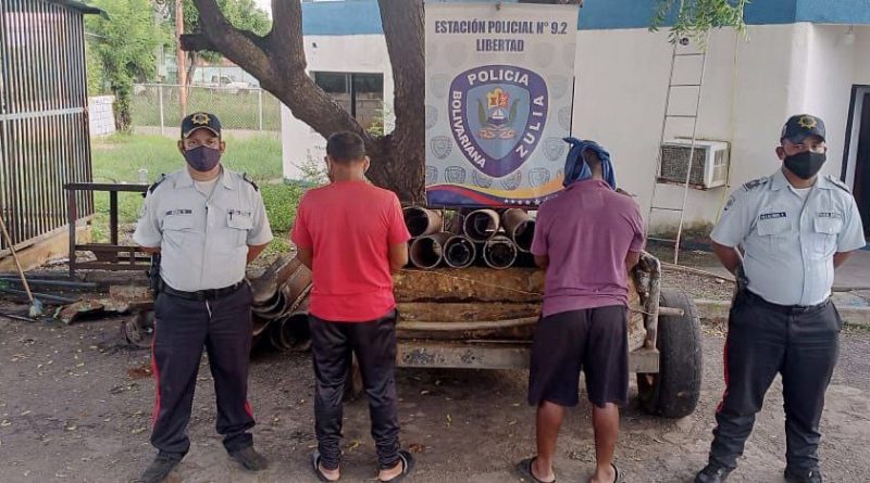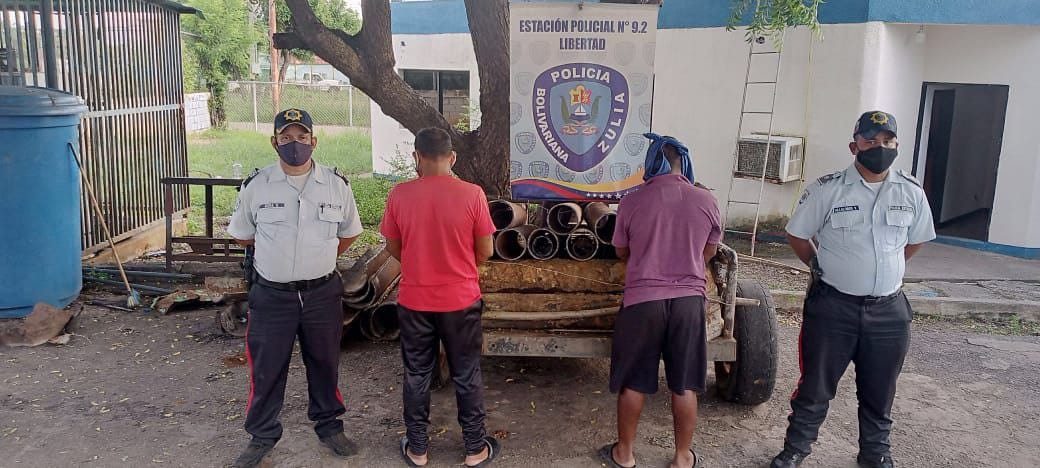 Durante labores de patrullajes por la parroquia Alonso de Ojeda, municipio Lagunillas, efectivos del Centro de Coordinación Policial Col-Sur, lograron la aprehensión de Deivi David Hernández Ollavez y Deny José Granada Orellana, con un cargamento de material ferroso, hurtado a la empresa petrolera nacional, según lo informó el C/J Sergio Villasmil, director general del Cuerpo de Policía del estado Zulia (Cpez).