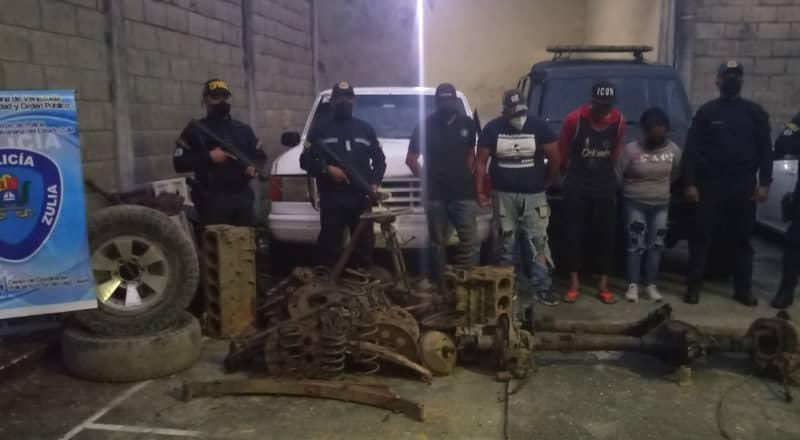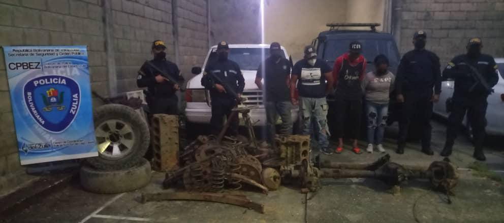Oficiales del Cuerpo de Policía del estado Zulia (Cpez) detuvieron en horas de la tarde de este viernes a cuatro sujetos identificados como Darwin Alonso González Vera, Delbis Jesús Araque Pérez, David Alfonso González Vera y Eduyeli Carolina López Reverol por posesión de material ferroso y partes de vehículos.
