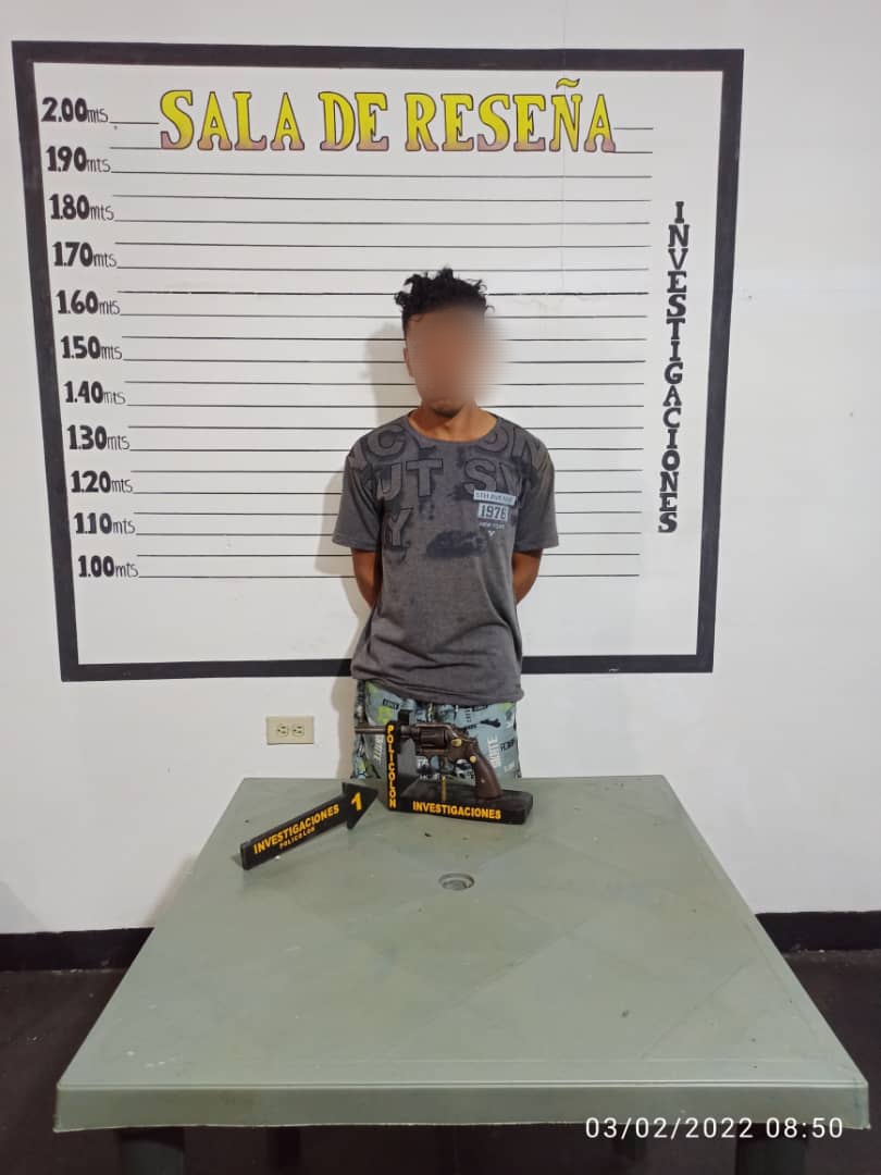 Una vez realizados todos los protocolos de seguridad, y amparados en el artículo 191 del código penal venezolano, este ciudadano se le encontró adherido a su cuerpo entre la pretina del pantalón un arma de fuego,  Marca Smith Wesson Especial, tipo Revólver, calibre 38,  serial 69187,  y en su interior dos proyectiles del mismo calibre, una vez asegurado con los ganchos de seguridad se procedió a trasladar al detenido a las instalaciones de la policía municipal para realizar todas las diligencias y ser puesto todos los elementos de convicción a la orden del Ministerio Público.
