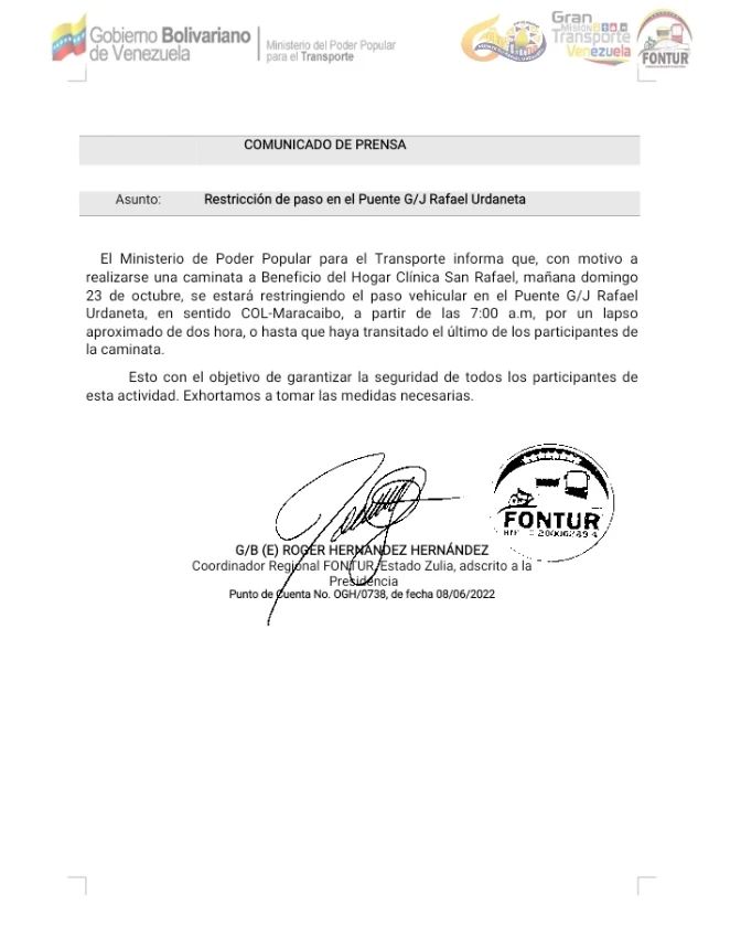 Este domingo se limitará el paso vehicular sobre el Puente General Rafael Urdaneta, por motivo a realizarse una caminata a beneficio del Hogar Clínica San Rafael a partir de las 7:00 de la mañana, según informó Fontur.