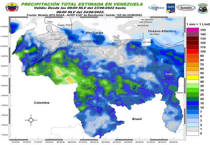 El organismo indicó en su reporte diario en redes sociales que igualmente se esperan lluvias y ráfagas de viento en Zulia, Táchira, Amazonas, Bolívar, Delta Amacuro y el Esequibo.