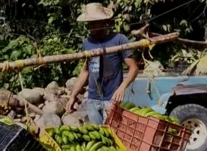 En el audiovisual se logra observar como un grupo de productores de cambur trasladan de un extremo a otro las cestas llenas de este fruto a fin llevarlos hasta la panamericana.