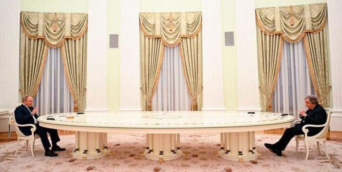 Sentado frente a Guterres en una larga mesa en el Kremlin, Putin dijo que los esfuerzos en las conversaciones con Ucrania se habían desbaratado por las denuncias de atrocidades cometidas por las fuerzas rusas en la ciudad de Bucha, en las afueras de Kiev.